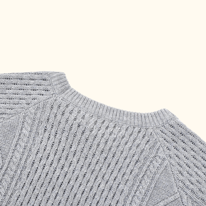Disponível nas cores cinza claro, off white e azul marinho, é uma peça versátil que combina com looks casuais ou sobreposições mais formais.