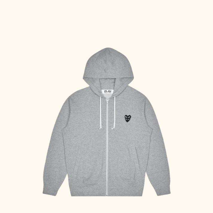 PLAY MOLETOM COM CAPUZ DE ALGODÃO COM ZÍPER EM BRANCO OU PRETO, COM DUPLO CORAÇÃO PRETO BORDADO NO PEITO.